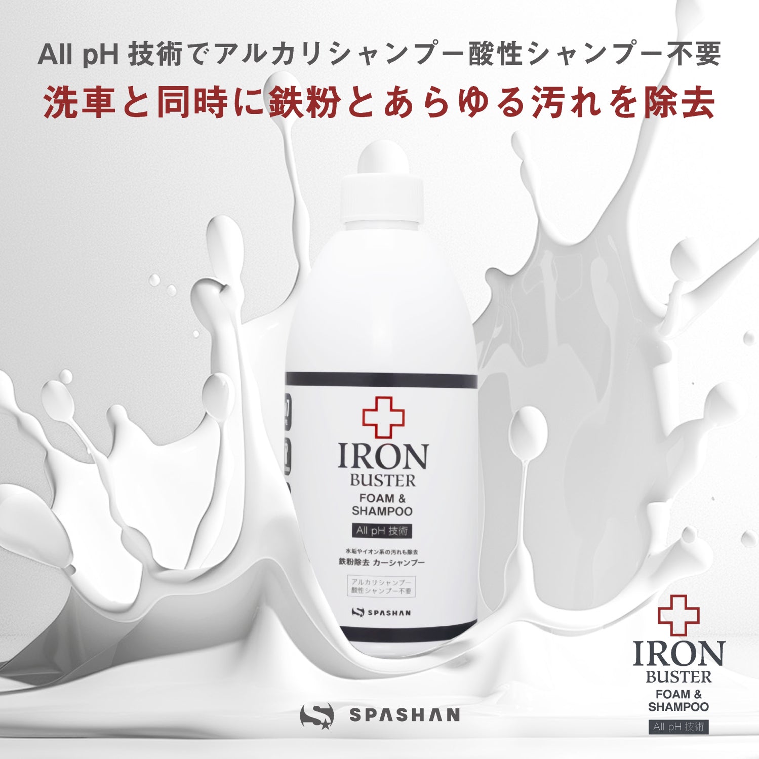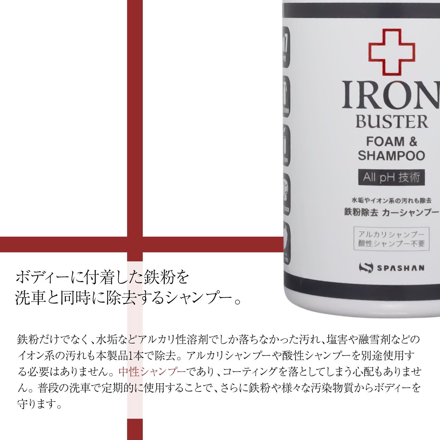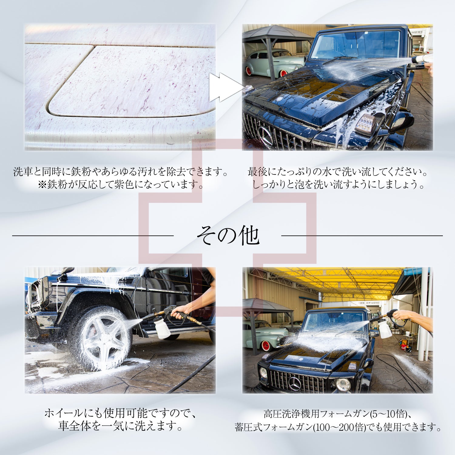 鉄粉だけでなく、水垢や鳥の糞などアルカリ性溶剤でしか落ちなかった汚れや、塩害や融雪剤などのイオン系の汚れも酸性シャンプー同様に除去する事が出来るので、アルカリシャンプーや酸性シャンプーの使用する必要がなくコレ1本で大丈夫です。