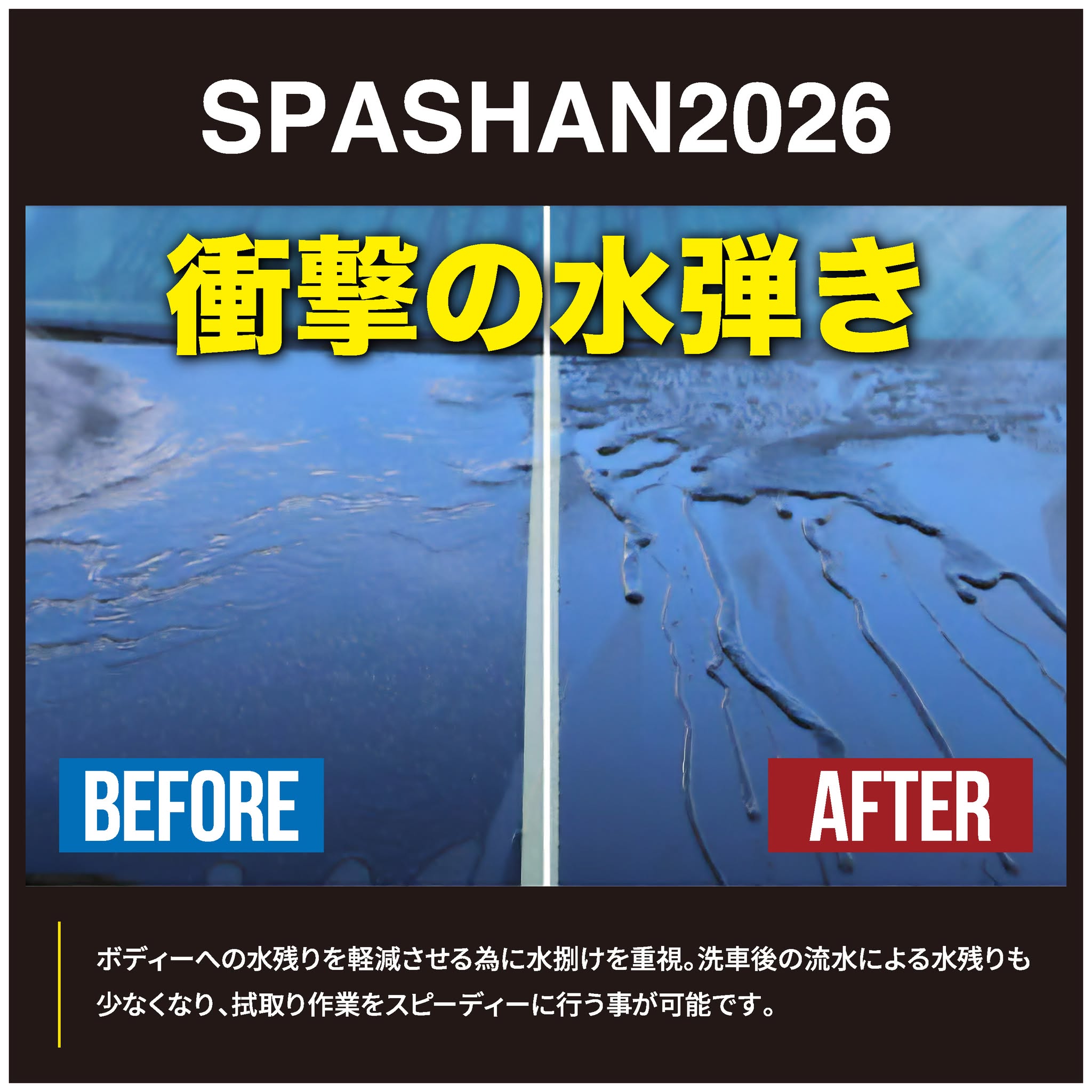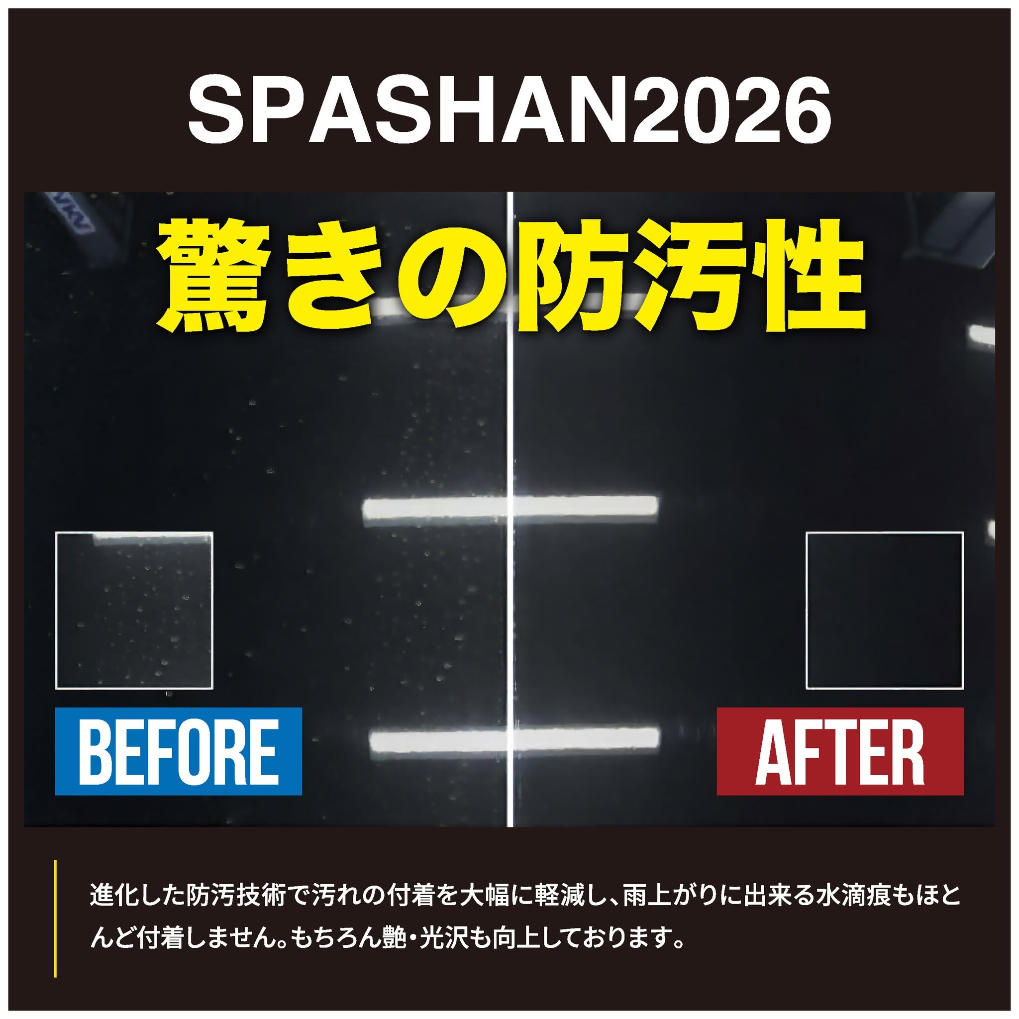 (4)透明感維持による累積効果 コーティングを重ねすぎた時に生じる、白ボケや曇りの発生を防ぎ、施工するごとに、光沢被膜と疎水被膜を「アップグレード」する累積効果を持たせました!
