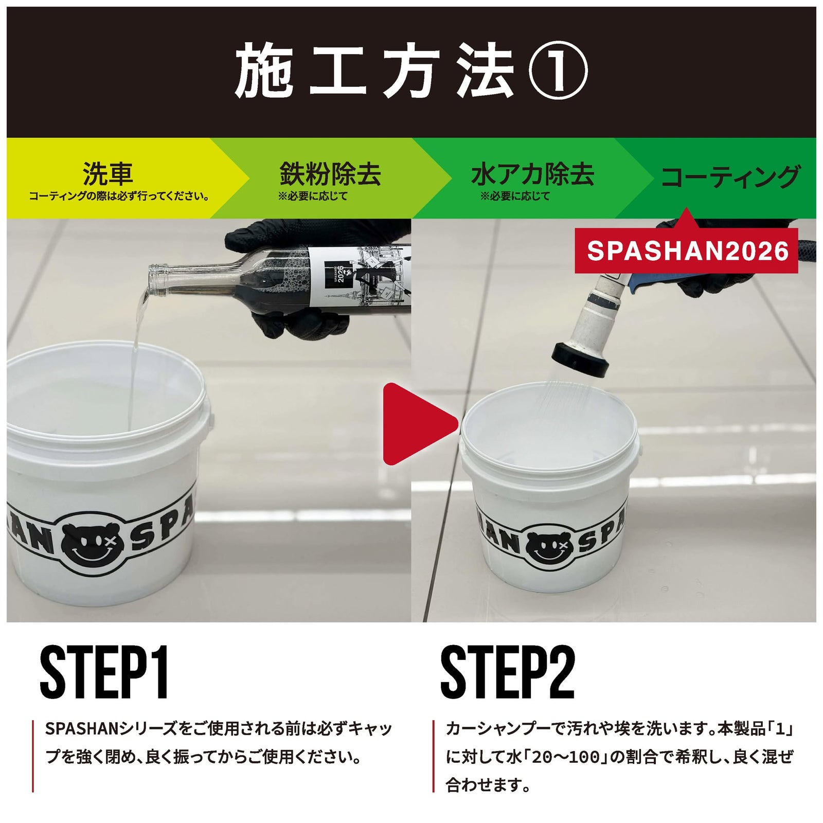 2,カーシャンプーで汚れや埃を洗います。本製品「1」に対して、水「20〜100」のお好みの割合で入れて良く混ぜ合わせます。